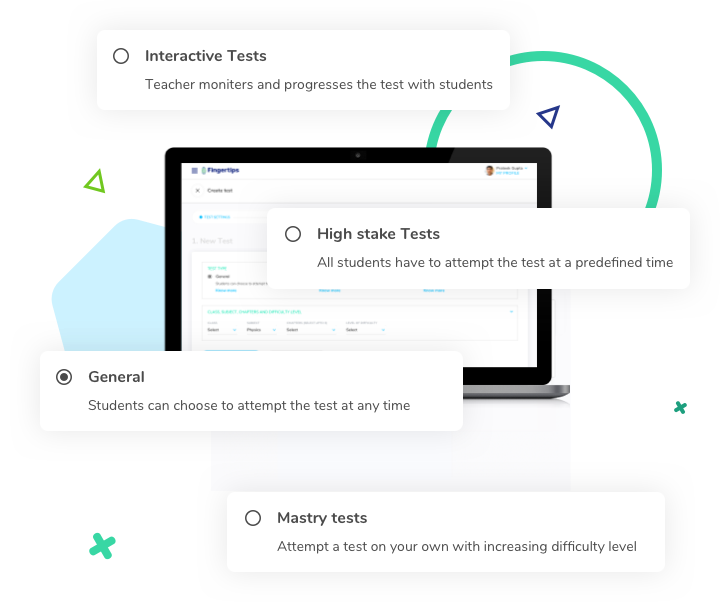 Teachers can use Fingertips to conduct different type of tests to meet different assessment needs, on any chapter. Teachers can decide testing parameters like degree of difficulty, number of questions and duration. They can schedule these tests at date and time of their choosing, to start simultaneously for all students under exam conditions or more informal home environment. They can also conduct highly engaging, synchronous quiz where question are flashed simultaneously to all students and answers are discussed before moving to next.